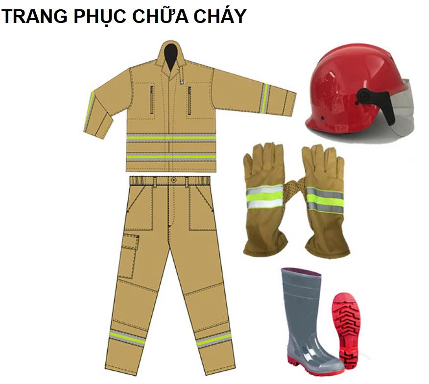 Trang phục PCCC theo Thông tư 48/2015/TT-BCA dành cho lực lượng dân phòng, cơ sở và chuyên ngành bao gồm 6 món: quần, áo, mũ, ủng, găng tay và khẩu trang chữa cháy.